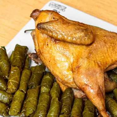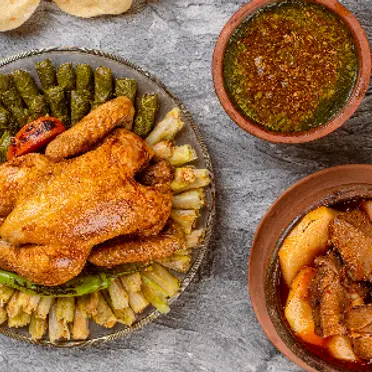 780 E.G.PEl Tablya TrayWhole roasted chicken, vegetables with meat casserole, molokhia and kilo mix vine leaves with cabbage