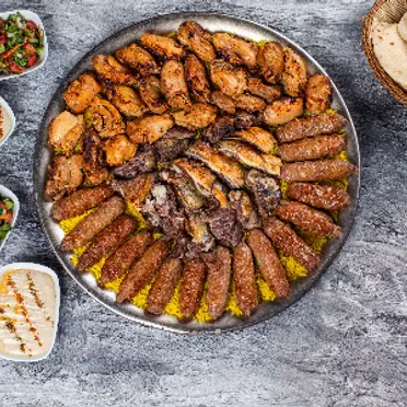 804 E.G.PEl Walema1/2 kilo kofta, 1/2 kilo shish tawook, 1/4 kilo kebab and 1/4 kilo mombar, served with rice, 2 green salad, 2 sesame paste salad and bread.