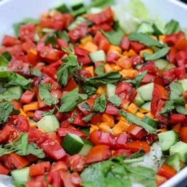 16 E.G.PTurkish SaladCrisp cucumbers, juicy tomatoes, and vibrant herbs, tossed in a tangy dressing.