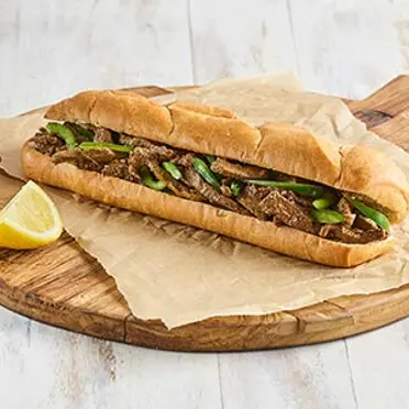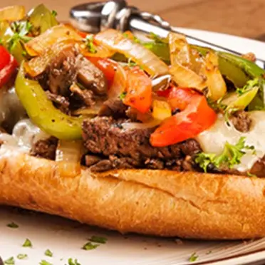 55 E.G.PMeat Fajita SandwichMade with juicy strips of seasoned beef, caramelized onions and peppers, topped with melted cheese and served in warm wrap