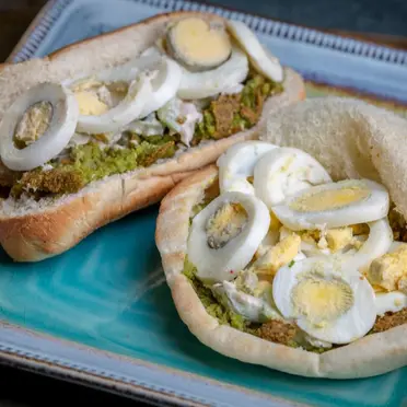 20 E.G.PFoul With Eggs SandwichCreamy foul beans and fluffy scrambled eggs nestled between soft bread.