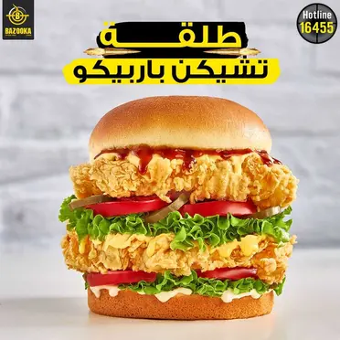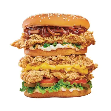 Crispy Chicken Breasts, Caramelized Onion, BBQ Sauce, Melted Cheese Sauce, Lettuce, Tomato, Pickled Cucumber, Mayonnaise