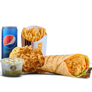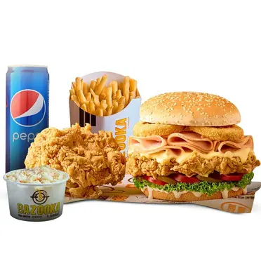 Double pan chicken burger or double beef burger sandwich + 1 chicken piece + medium coleslaw + pepsi + rice cup