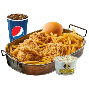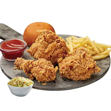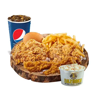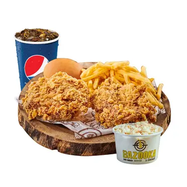 2 Crispy Chicken Pieces and 2 Crispy Strip Chicken Pieces, Served with French Fries, Coleslaw Salad, Pepsi and Bread.