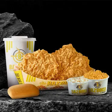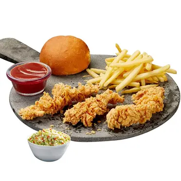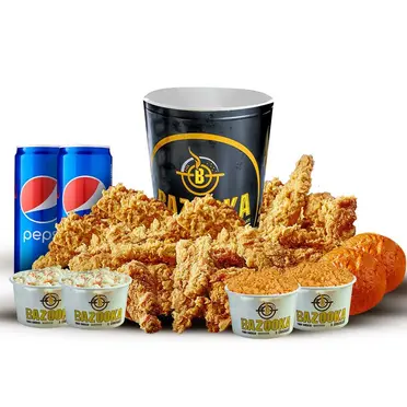 10 Pieces of Chicken Strips, Large Coleslaw Salad, Large French Fries, 4 Buns and 1 Liter Pepsi.