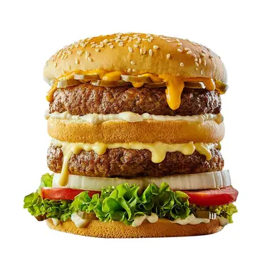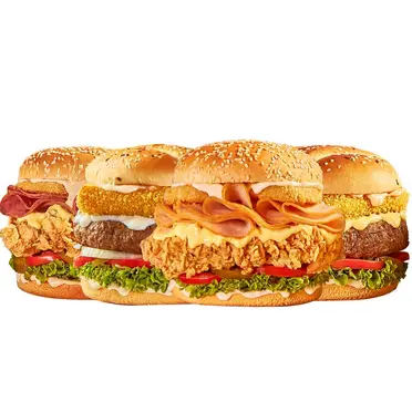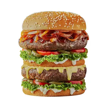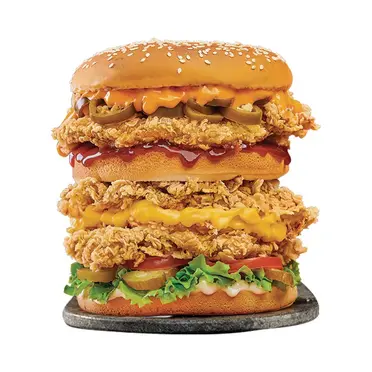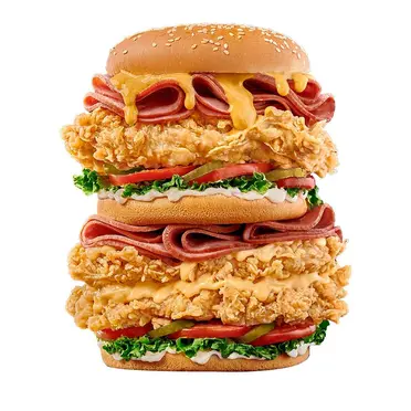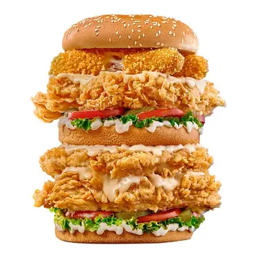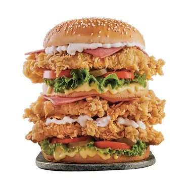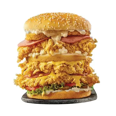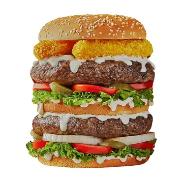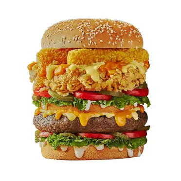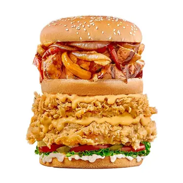 Crispy chicken breasts, onion rings, pepper mayonnaise sauce, roast beef, melted cheese sauce, fried onion rings, lettuce, tomato, pickled cucumber, mayonnaise