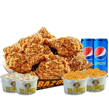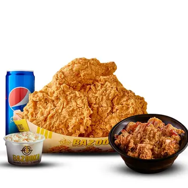 6 pieces of chicken and 6 pieces of chicken strips, served with family french fries, large coleslaw salad, liter pepsi and bread.