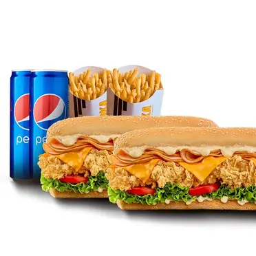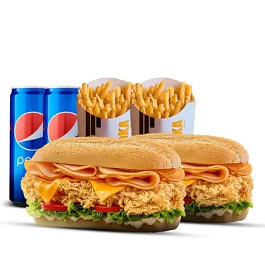 2 double sandwiches of your choice, served with 2 medium french fries and 2 Pepsi cans.