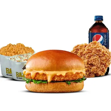 Single pan chicken burger sandwich or single beef burger + 1 chicken piece + medium coleslaw + Pepsi + rice cup