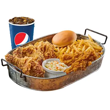 4 pieces of chicken, fries, slaw, pepsi and bread