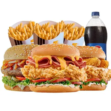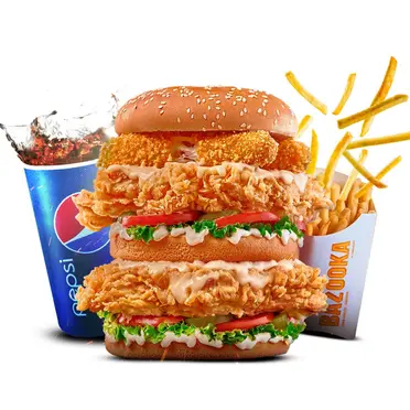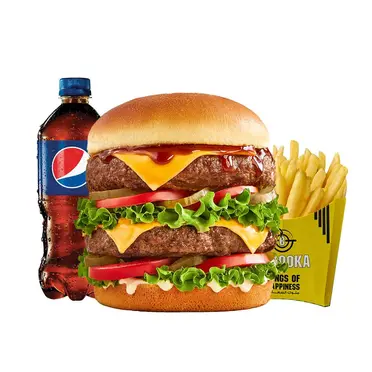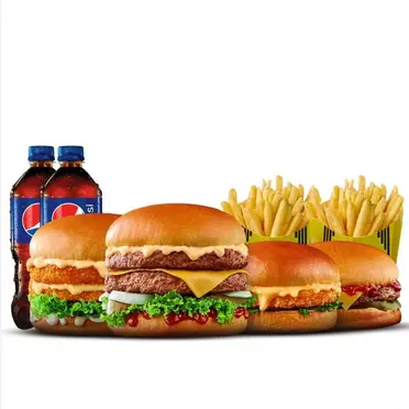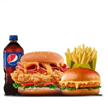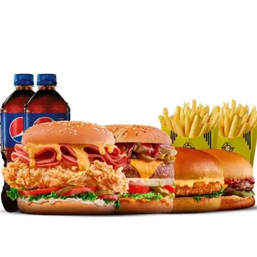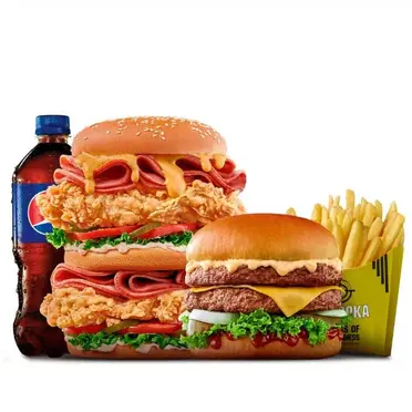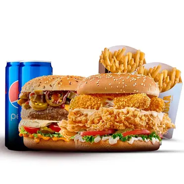 1 double beef or chicken sandwich + 1 double beef burger or 1 double chicken burger + 1 Pepsi can + medium fries
