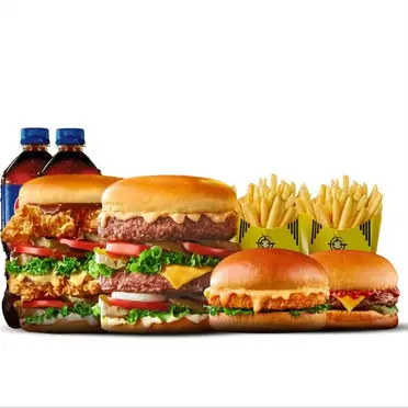 1 double chicken shot + 1 double burger shot + 1 single chicken burger + 1 single beef burger + 2 medium fries + 2 cans