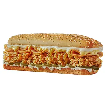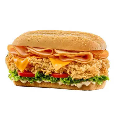 Crispy Chicken Breasts, Smoked Turkey, Melted Cheese Sauce, Onion Rings, Lettuce, Tomatoes, Pickled Cucumber, Mayonnaise