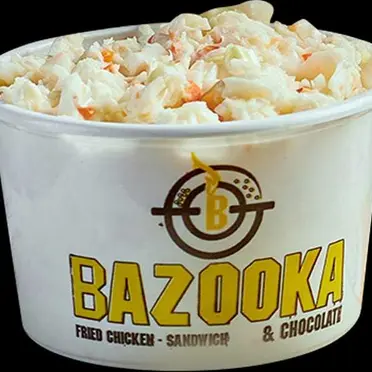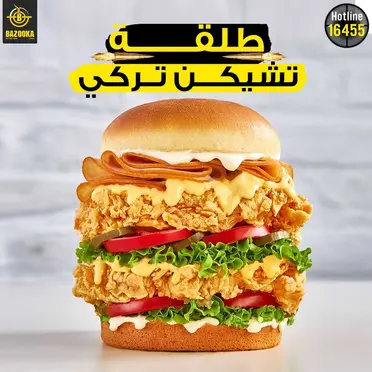 120 E.G.PBazooka super crunchy sandwichCrispy chicken breasts, smoked turkey, pickled cucumber, melted mozzarella cheese sauce and mayonnaise, served with coleslaw salad.