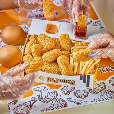 150 E.G.PRPGMozzarella Sticks, Magic Bazooka Sauce, Cheese Sauce, Chicken Breasts, Mayonnaise, Lettuce, Beef Piece, Special Bazooka Sauce, Tomatoes, Cucumber