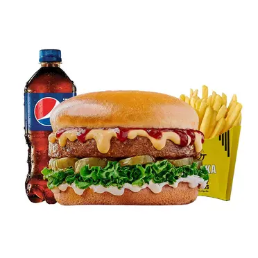 1 single beef or chicken sandwich + 1 single beef burger or 1 single chicken burger + 1 Pepsi can + medium fries